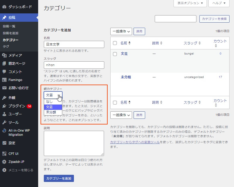 2.カテゴリーを新規作成し、「親カテゴリー」のセレクトから、親に指定したいカテゴリーを選択し、「カテゴリーを追加」をクリックします。