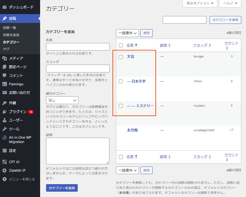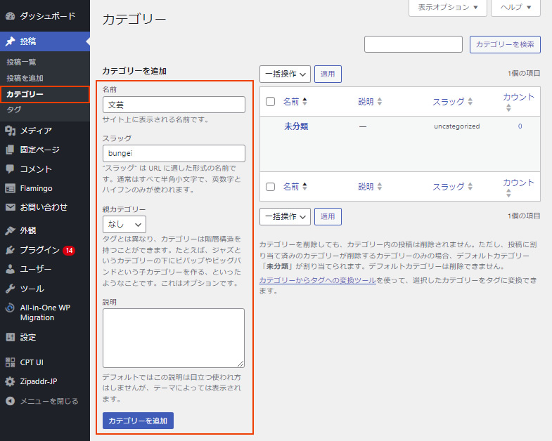 名前、スラッグ、親カテゴリー(任意)、説明(任意)を入力して「カテゴリーを追加」をクリックします。
