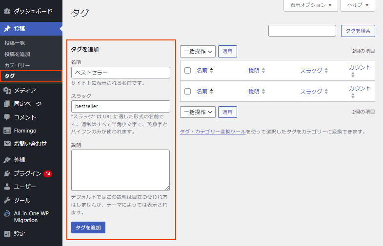 名前、スラッグ、説明(任意)を入力して「タグを追加」をクリックします。