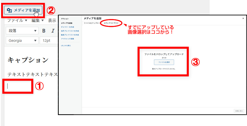 挿入したい画像をWordPressにアップロードして、記事に挿入します。