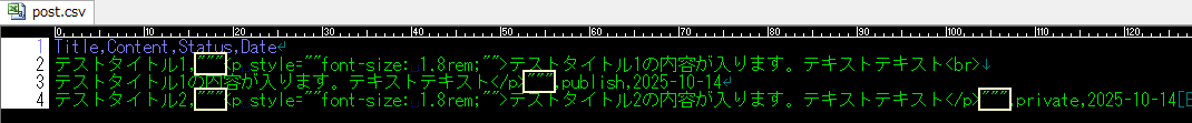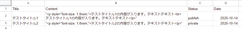 • 1行目に項目名を含める(例:Title, Content, Status, Date)※項目名に決まりはなく、任意
