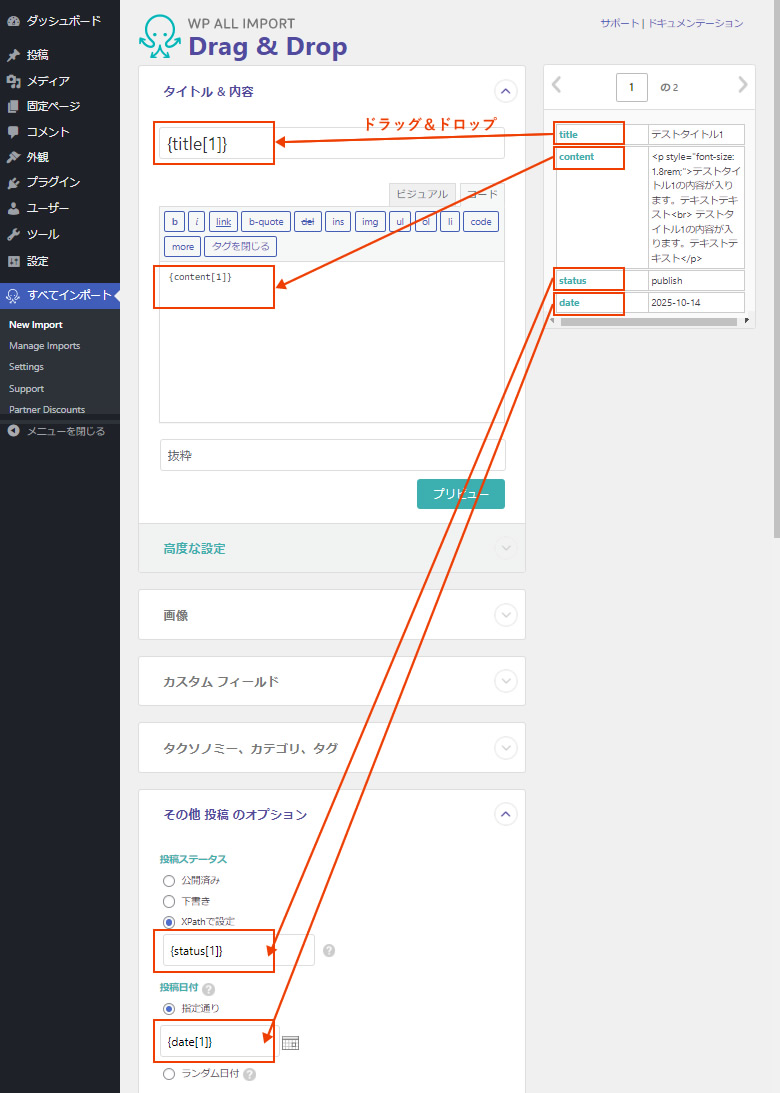 左カラムにはWordPress側のフィールドが、右カラムにはCSV内の項目名と値が表示されます。