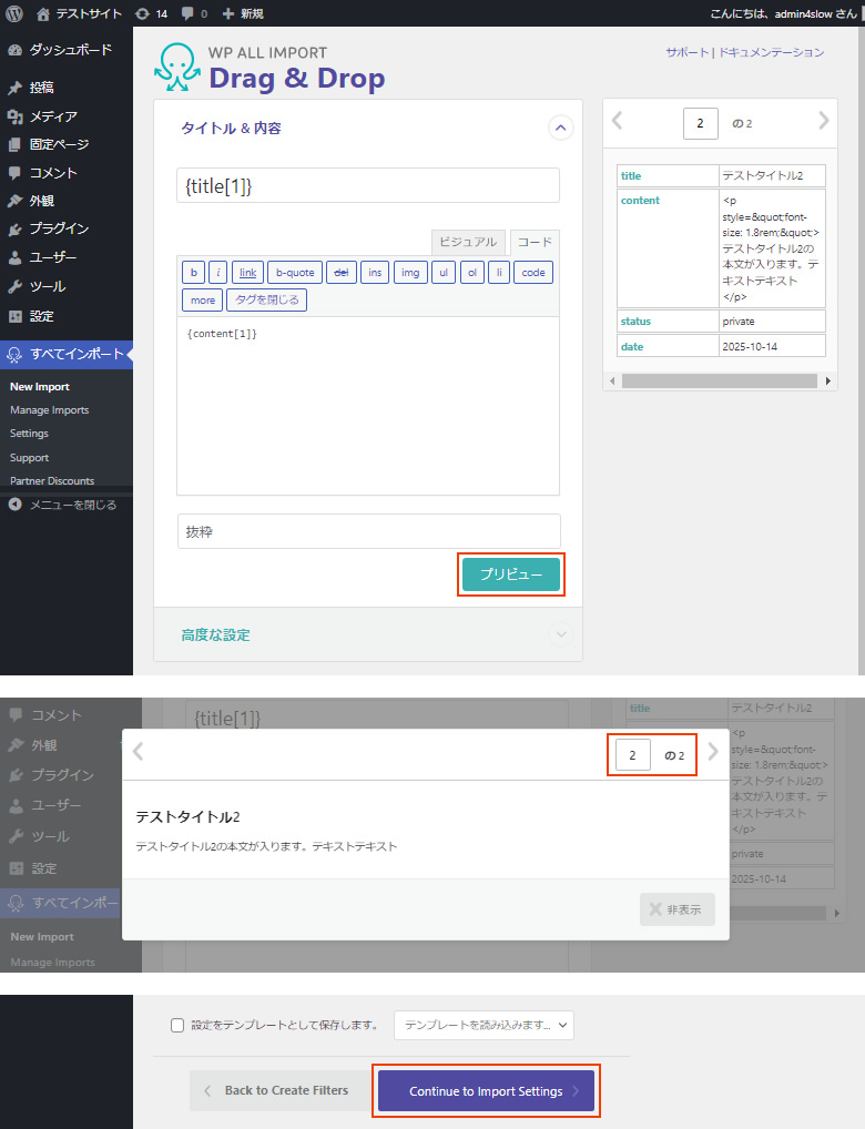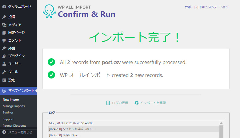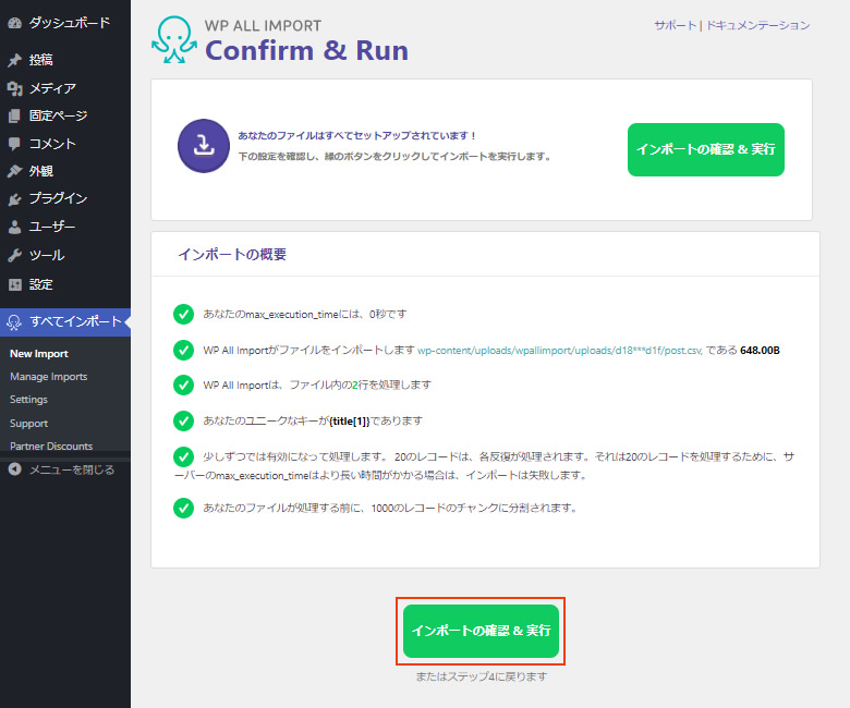 最後に「インポートの確認&実行」をクリックすると、インポートが開始されます。