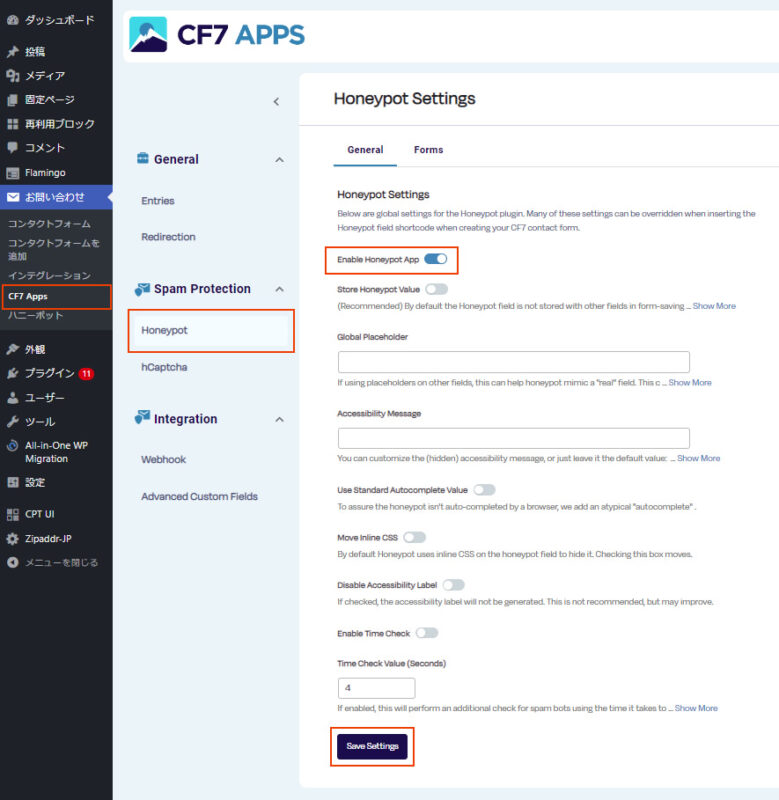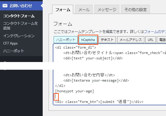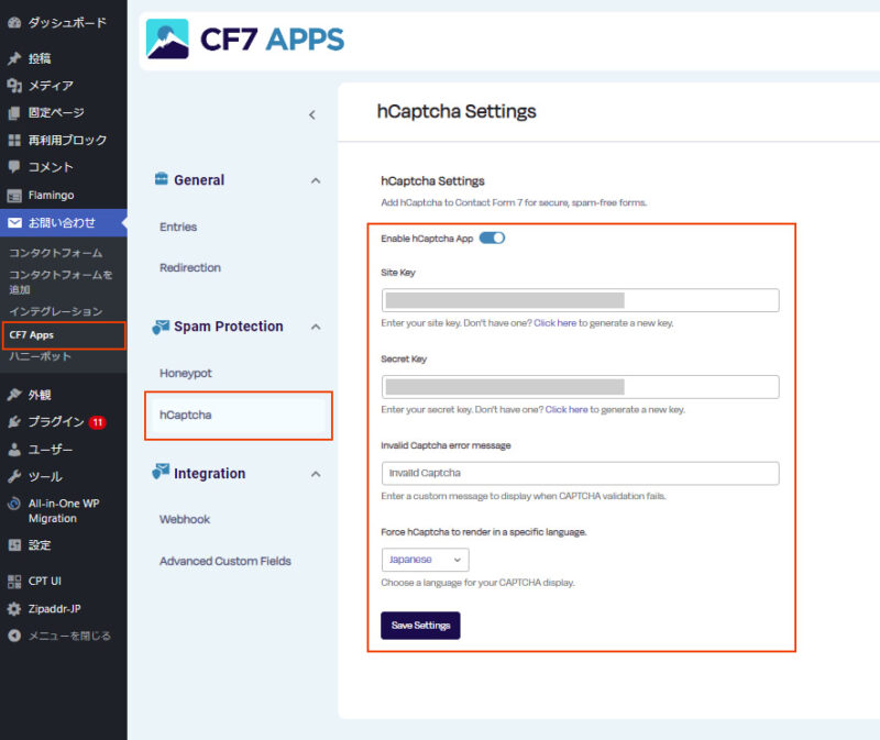 [WordPress] プラグイン「CF7 Apps – [Honeypot and hCAPTCHA for Contact Form 7]」の使い方