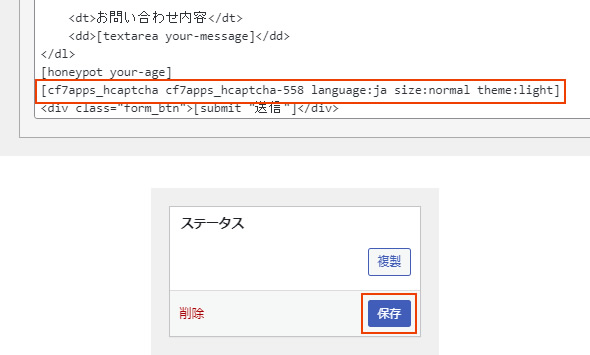 hCaptchaのタグが挿入されたことを確認したら、「保存」をクリックします。