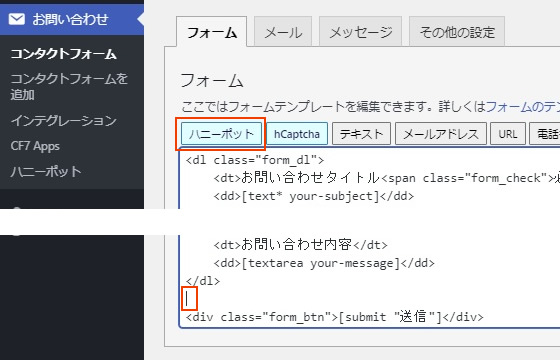 送信ボタンの上あたりにカーソルを合わせ「ハニーポット」をクリックします。