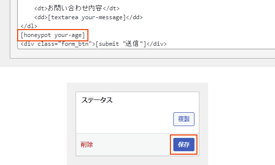 honeypotのタグが挿入されたことを確認したら、「保存」をクリックします。