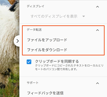 - ファイルをアップロード:操作する側(クライアント)から、操作される側(ホスト)へファイルを転送できます。