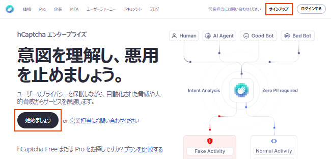 まずは hCAPTCHA の公式サイトにアクセスします。