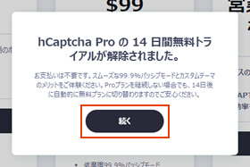 「hCAPTCHA Pro の14日間無料トライアルが解除されました」というポップアップが表示されるため、[続く] をクリックします。