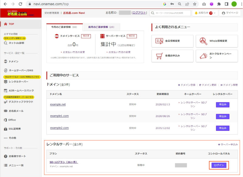 (お名前.com Navi TOPのご利用中のサービス欄からも確認できます。)