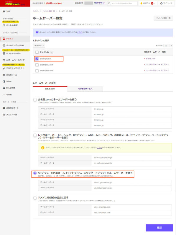 - 「SDプラン、お名前メールのネームサーバーを使う」にチェック