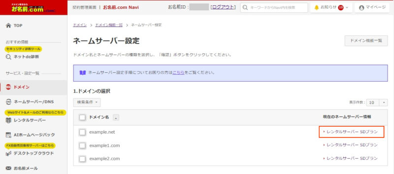 該当ドメイン行の [現在のネームサーバー情報] が「お名前.com」になっている場合は、SDプランではなくお名前.com側DNSが参照されています。