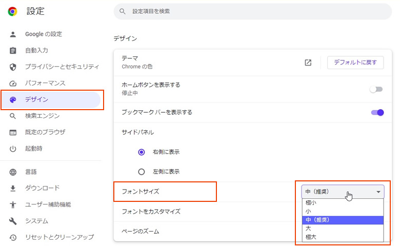 たとえば Chrome では「設定 → デザイン → フォントサイズ」から文字サイズを変更できます。