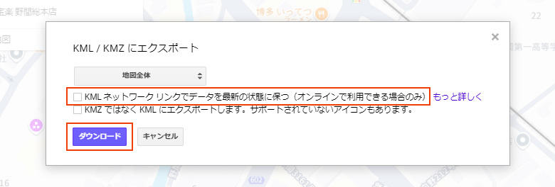 Googleマイマップの「KML / KMZ にエクスポート」には、いくつかの選択肢があります。