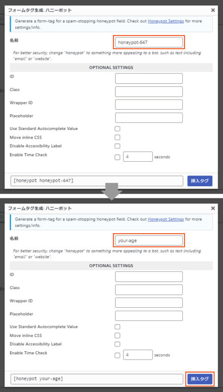 例えば、フォームで [text your-age] を使用している場合、honeypot に [honeypot your-age] を指定してはいけません。